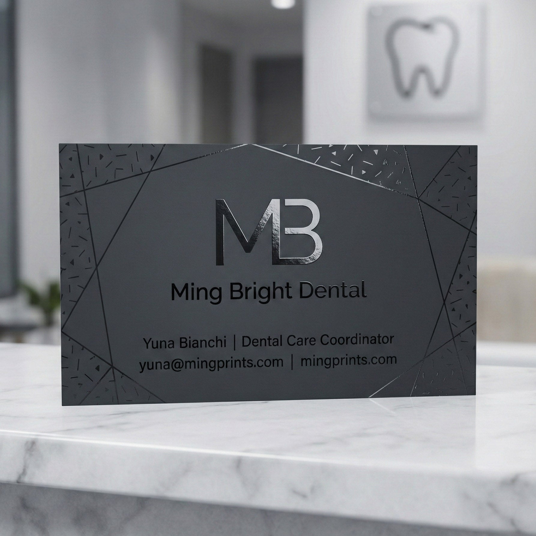 Spot UV business cards undergo post-processing with a matte laminating film, followed by the application of a glossy varnish for a sleek finish.